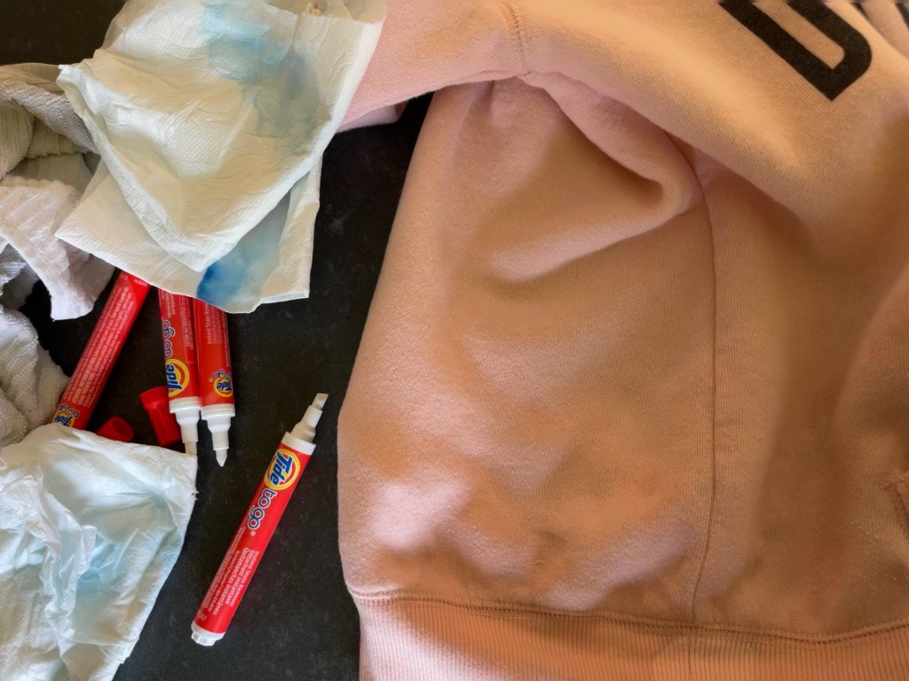 I’d been happily, gratefully wearing them for a few weeks when I pulled a load of laundry out of the dryer. My eye immediately fell on the giant splat of blue ink on my new pink sweatshirt. My stomach dropped as I pulled out a second sweatshirt with multiple blue marks. And there were yet more on the third. Remarkably (and very thankfully), the ink – which was from a pen I’d foolishly left in my pocket – avoided every single piece of John’s clothing and the rest of mine.