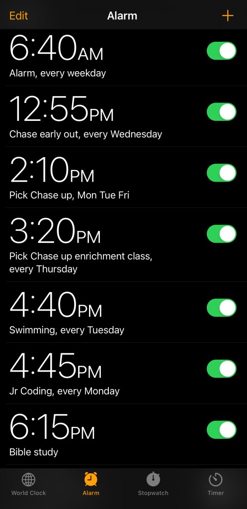 If you look on my phone, you will find all sorts of alarms scheduled to alert me to various activities. The obvious one is my morning alarm that makes sure I am awake to get Chase fed and ready for the school day; one I’m particularly dependent on after transitioning from summer when I was free to start the day whenever my body deemed it pleasing. But I also set alarms to remind me to pick up Chase from school at varying times depending on the day of the week, as well as for his extra-curricular activities (and mine) which I’ve been known to completely blank on without a reminder.