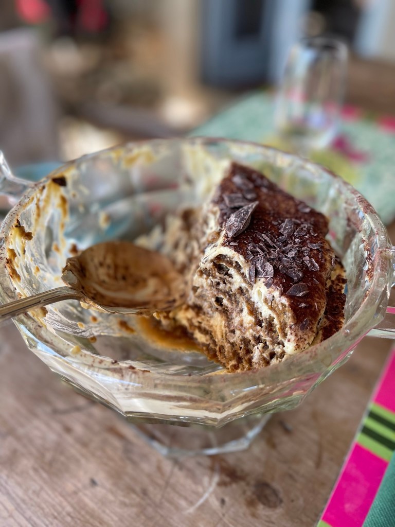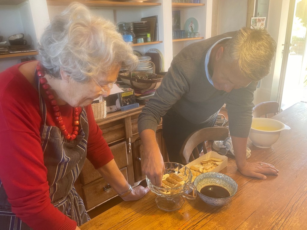 Which is just what we did. At perfect ease in these surroundings, we took turns layering coffee-drenched ladyfingers with mascarpone and topping the rich tiramisu with cocoa powder while she alternated between instructing us, praising us like small children and playfully teasing us for our mistakes. She recruited us to chop broad beans and shell peas, responding all the while to questions we threw her way, not giving her whole story away at once as though it had been rehearsed, but revealing with openness the pieces deemed relevant by our curiosity. Over the hours, we listened and we learned – about her time in the States when she was younger (which explained her excellent English) and the successful high-end hat company she ran with her father (which explained the fascinating room full of hat molds), about her grown children and the 500 rose bushes she had grown at one point, about the way Italians approach life and cooking, about how it gets so hot in August that they don’t do anything but exist. We talked some more and we laughed, sinking ever more deeply into the warmth of our surroundings, pausing now and again to take a sip of wine or respond to the crackling of the sambiocca, demanding more liquid in the pan.