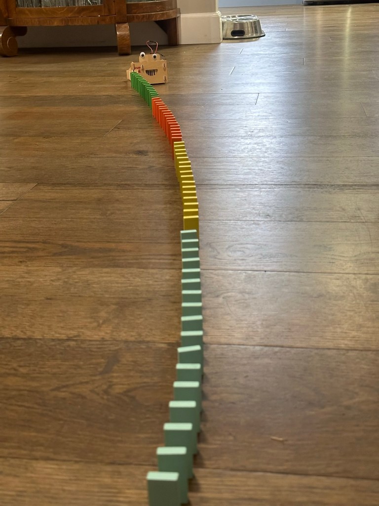 The other box, a domino machine, seemed to be calling my name so I set up shop at the big table and dumped the contents, deciding to build it whether or not Chase wanted to participate. As a quick aside, I am terrible at following instructions. Details, like which particular direction a thing should go, seem far beyond my mental capacity. I think Chase’s interest was piqued not only because the inside of the box was far more interesting than the outside, but also to intervene in my constant refrain of “oops.”